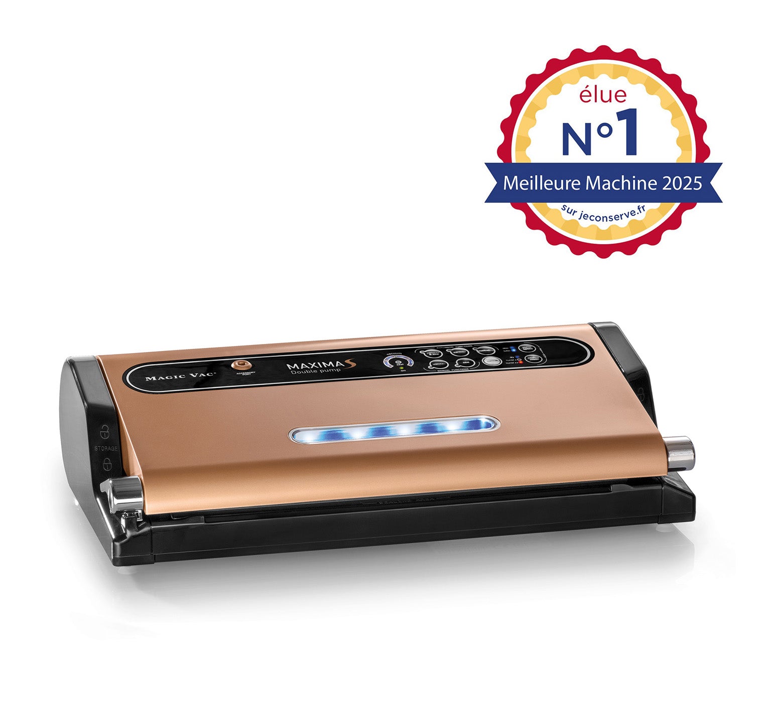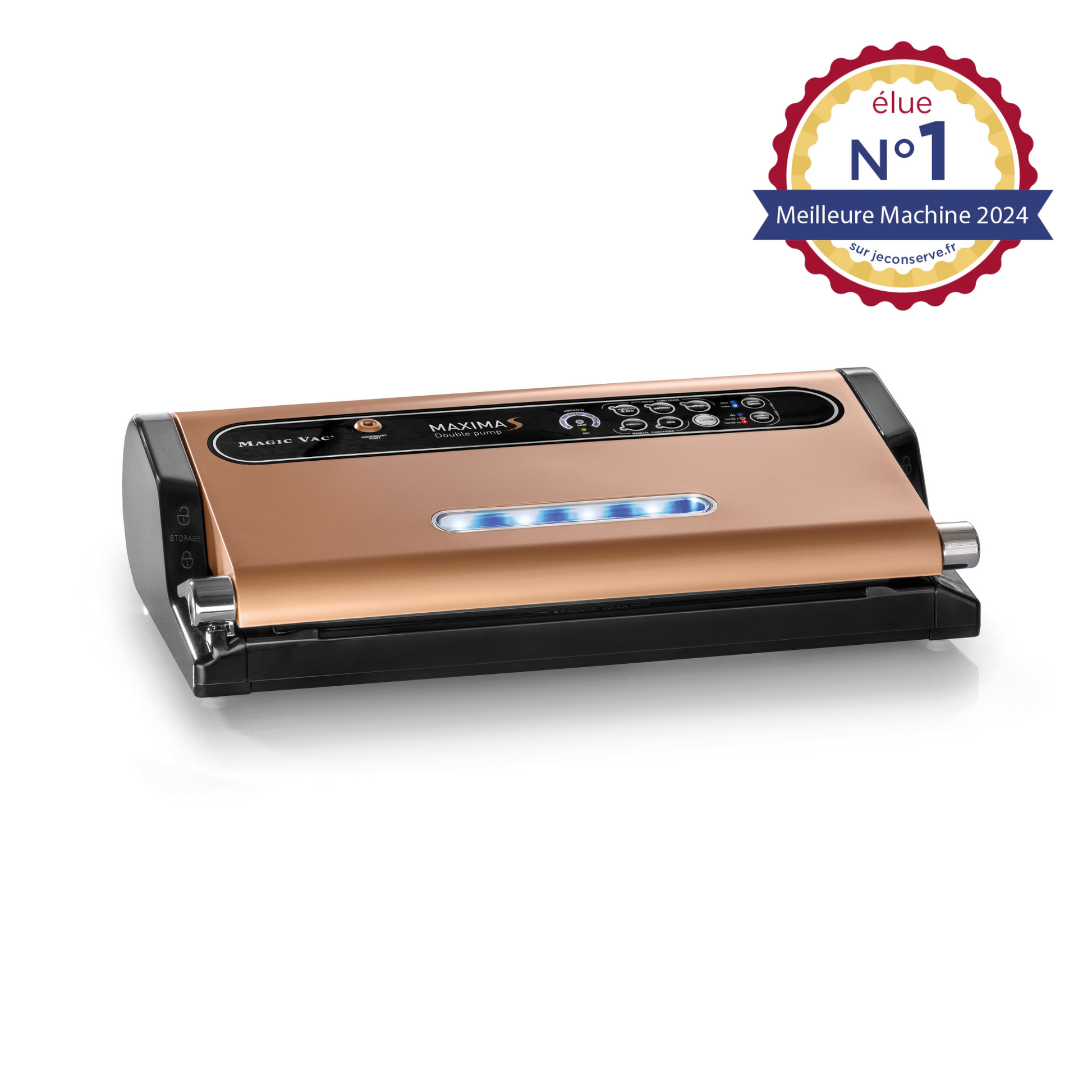 La machine experte de la mise sous vide avec ses nombreux programmes et sa double pompe à piston en nylon et en carbone, Maxima S permet une utilisation domestique ou semi-professionnelle. Elle permet de faire le vide à 98 %, et beaucoup de mises sous vide d’affilé en un temps record ! La machine a été élue Numéro 1 des machines sous vides en 2024 par jeconserve.
